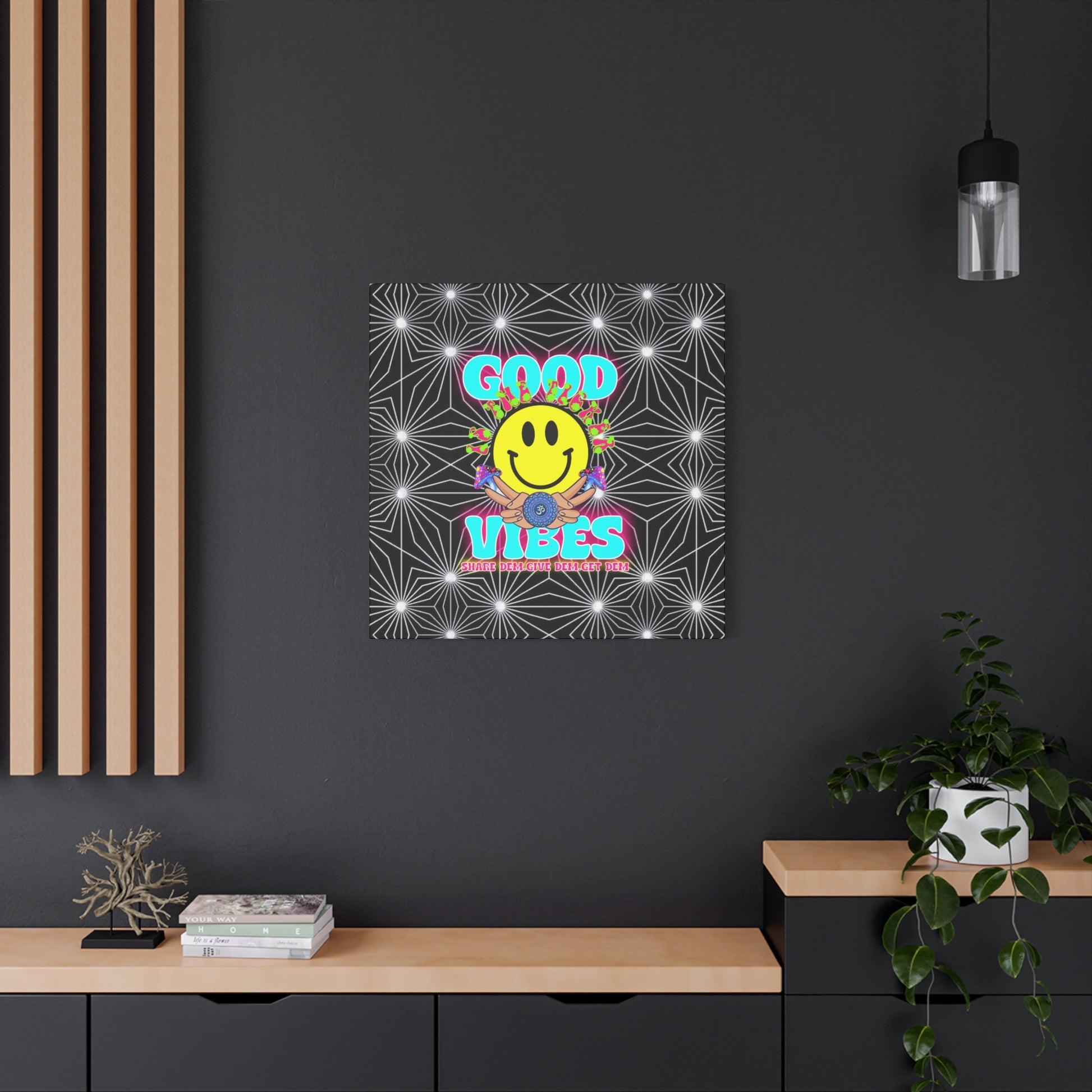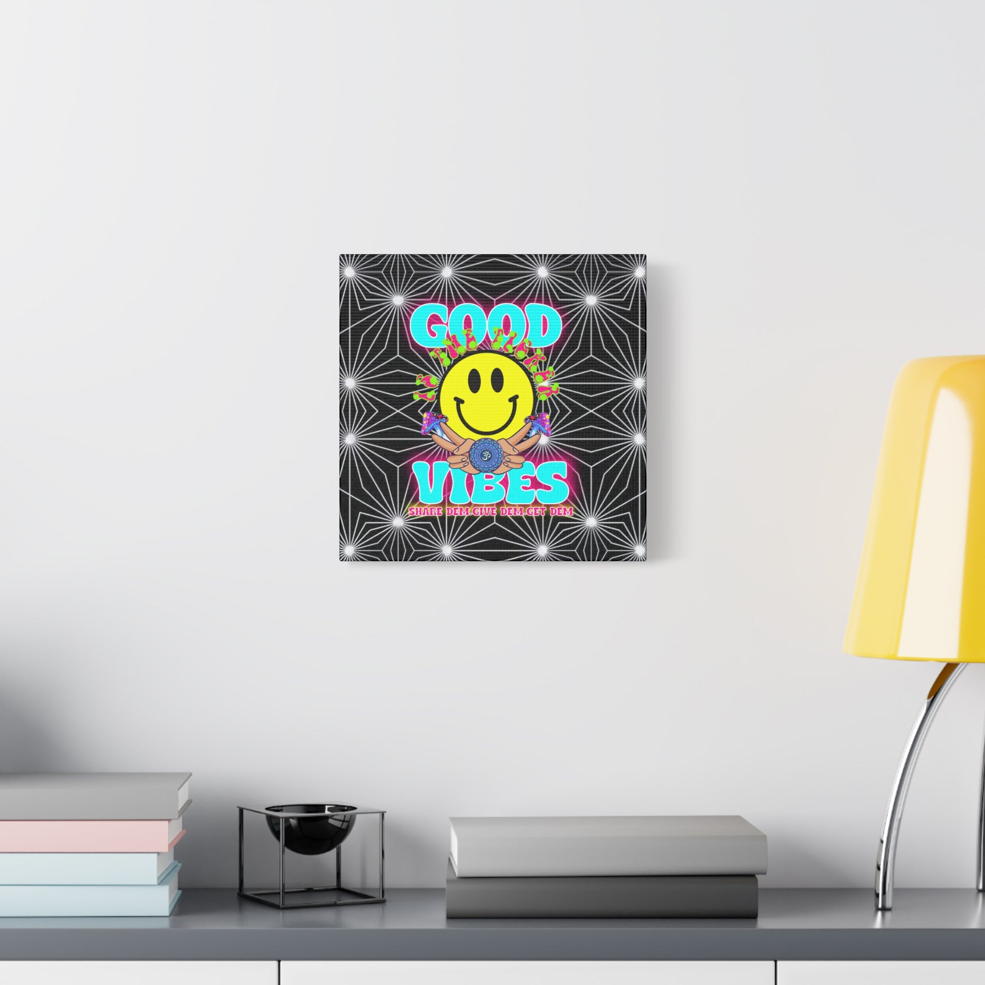 This canvas print combines the best of psychedelic art with a modern, spiritual twist. The optical illusion style makes the artwork stand out, creating a dynamic and immersive visual experience. The "Good Vibes" text and smiling faces infuse your space with an aura of happiness, positivity, and good energy. Whether you're looking to enhance your living room, bedroom, or office, this print is a great way to spread good vibes and inspiration.